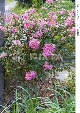 初秋9月の路傍に咲くサルスベリのピンクの花