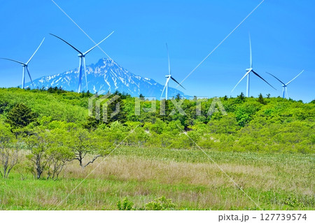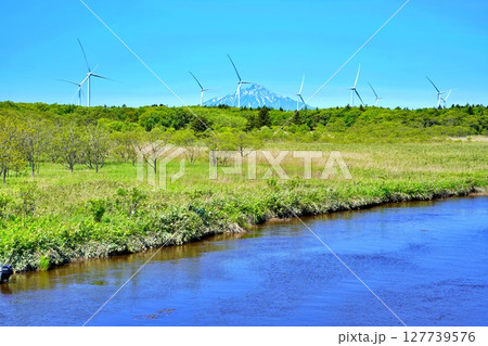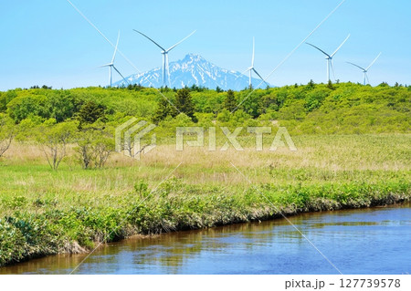夏の北海道 サロベツ原野から望む利尻富士と風車