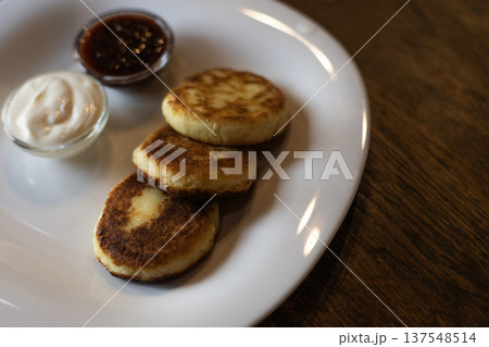 Golden fried syrniki on plate, Closeup of crispy edges and soft centers, Delicious fried syrniki showcasing crisp edges and tender cottage cheese filling on white dish