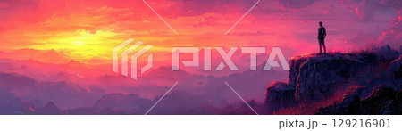 Landscape background wallpaper Breathtaking sunset over rocky mountain cliffs, with vibrant pink and orange hues illuminating sky. lone figure stands atop cliff, embracing beauty of nature