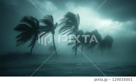 Dramatic image of palm trees bending in strong wind under dark stormy sky