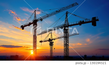 Striking silhouette of construction cranes at sunset silhouette