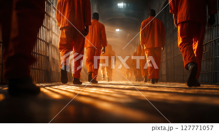 Orange-clad prisoners walking in dimly lit corridor of correctional facility, light streaming through bars, dramatic shadows on floor