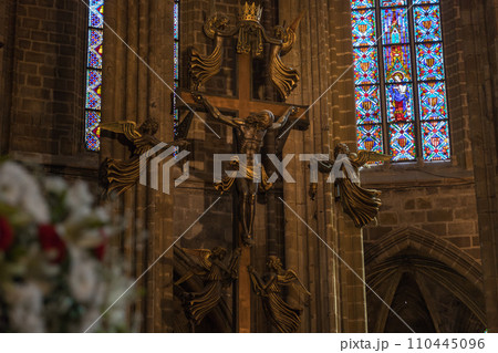 バルセロナのサンタ・エウラリア大聖堂のキリスト像とステンドグラス