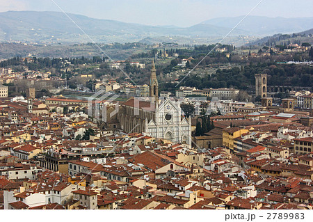 南欧イタリアのフィレンツェ 世界遺産歴史地区ジョットの鐘楼からのサンタクローチェ聖堂やヴェッキオ宮殿