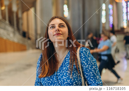 Happy woman posing into the La Sagrada Familia - the impressive cathedral designed by Gaudi. Concept of travel, tourism and vacation in city.