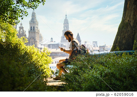 Young Man On Pilgrimage At Santiago De Compostela With Phone