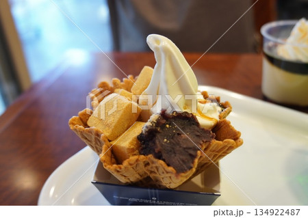 チョコレートソースがかかったカップ入りのバニラソフトクリーム
