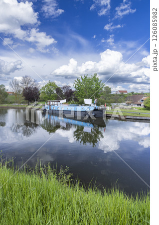 Houseboat reflecting on the calm water of a canal in the French countryside under a blue sky with white clouds