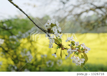 春のフランス地方の菜の花畑バックの桜の枝と花