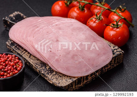 Sliced ham, meat or pork sausage for sandwiches. Cooked smoked prosciutto, ham