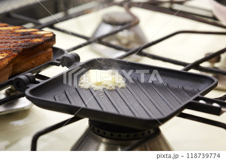 Grilled sandwich with cheese, salmon, onions, and peppers being grilled in a sandwich maker