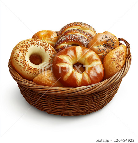 A basket of breads, bagels, and French rolls, isolated on a white background.