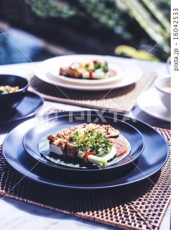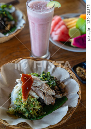 バリ島の伝統料理バビグリンとトロピカルフルーツの食卓