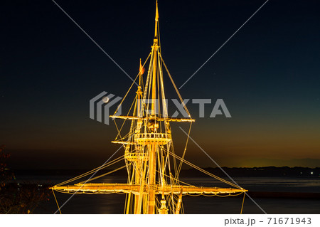 ライトアップされた復元船サンファンバウティスタ号のマストと三日月