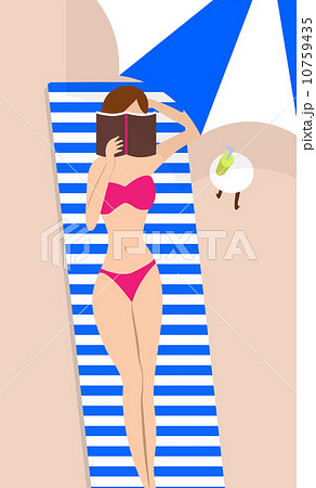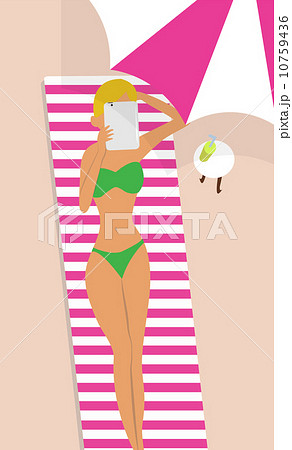 海辺で寝そべってタブレットPCで読書をする女性 金髪