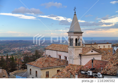 イタリアに囲まれたサンマリノ共和国 世界遺産サンマリノ歴史地区のサンマリノ大聖堂と朝焼け空の景色