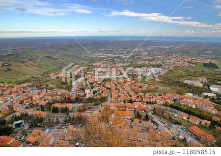 イタリアの中のサンマリノ共和国 ティターノ山麓の世界遺産ボルゴマッジョーレ旧市街とアドリア海の景色