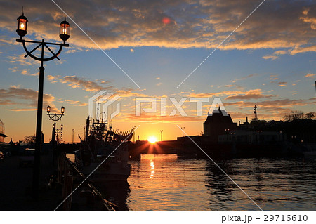 朝焼けの漁港を出る漁船 / 北海道の漁港 新鮮な魚介類のイメージ