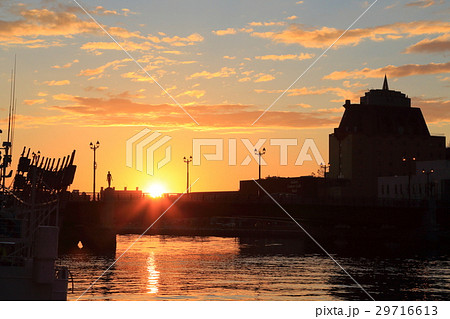 朝焼けの幣舞橋と停泊中のサンマ漁船