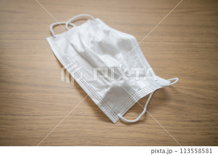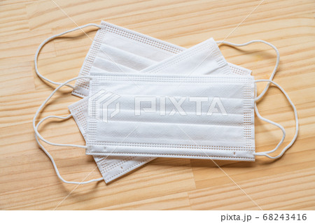 木目テーブルの上の三枚のサージカルマスク 不織布マスク 新型コロナウイルス感染防止対策 予防