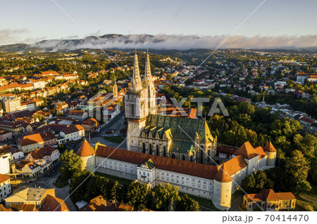 Aerial view of the Cathedral in Zagreb at sunrise. Croatia.