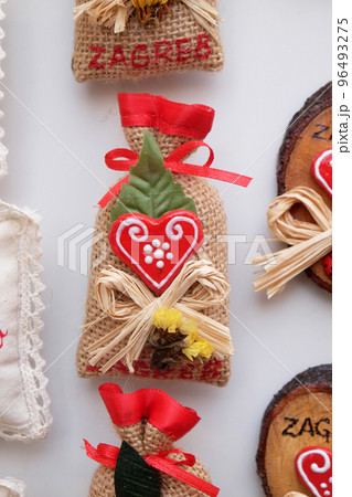 Souvenirs on stall with decorations for winter holidays at traditional annual Christmas market in Zagreb, Croatia
