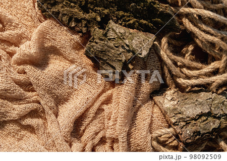 Rustic display. Eco material. Product showcase. Cracked brown wood bark pieces twisted rope on beige wrinkled sack cloth free space decorative background.