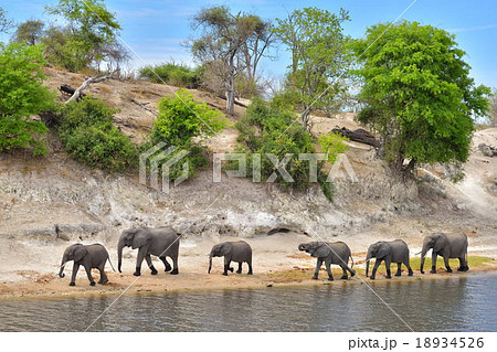 ザンベジ川のほとりを歩く象の群れ