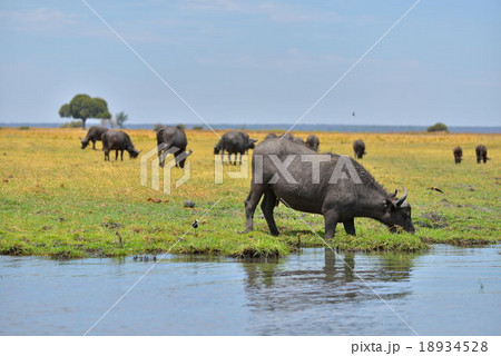 ザンベジ川のほとりで草を食べるバッファロー