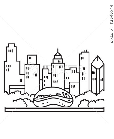 Chicago Downtown Skyline with the Bean or Cloud Gate Sculpture on Park Grill Lake Michigan Illinois USA Mono Line Art Poster