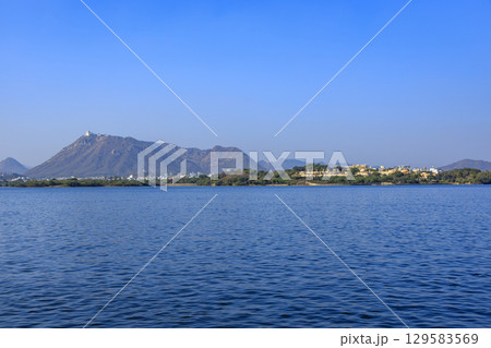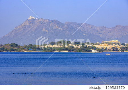 レイク・ピチョーラ越しに望むザ・オベロイ・ウダイヴィラースとサジャンガル・モンスーン宮殿