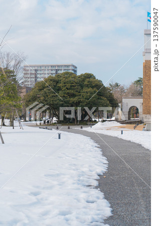 石川県政記念しいのき迎賓館と堂形のシイノキの雪景色