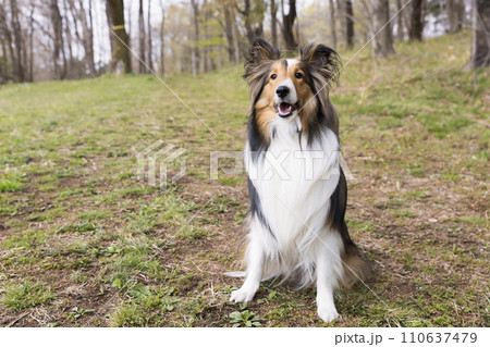 散歩中風に吹かれてお座りをするシェルティー 犬
