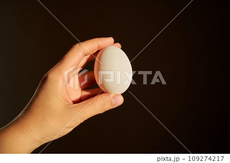 White chicken egg in a woman's hand.