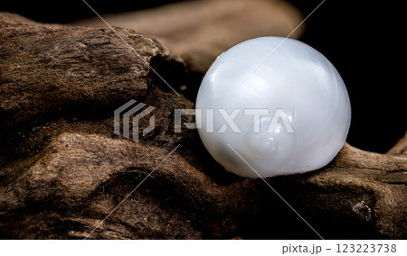 Turritella shell on driftwood macro black background