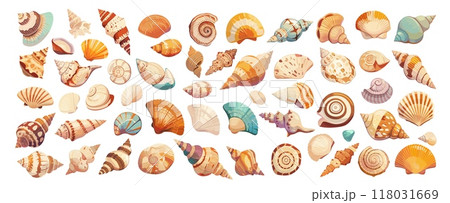 Set of various shells spiral shell, clam, starfish. Beach illustration, marine concept.