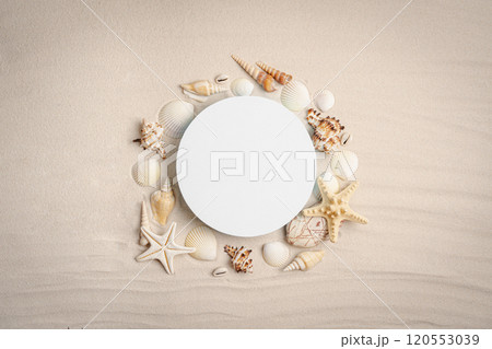 Abstract summer beach scene with a composition of sea sand and shells on a beige background.
