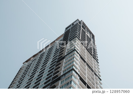 A tall modern highrise building stands against a clear sky, showcasing its design