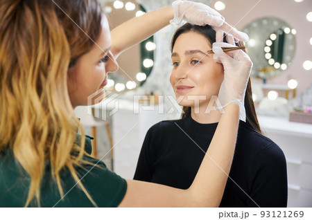 Smiling young woman having eyebrow correction procedure in beauty salon. Female esthetician in sterile gloves shaping woman eyebrows with cosmetic tweezers.