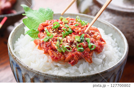 熱々のご飯にのせたチャンジャ ( チャンジャご飯 )