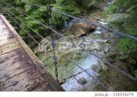 吊り橋から見下ろす新緑の渓流と背景