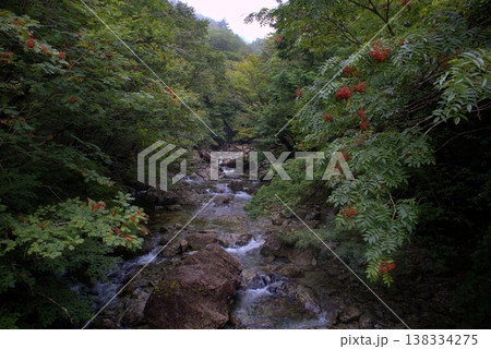 新緑の渓流と赤い実がなる樹木の背景