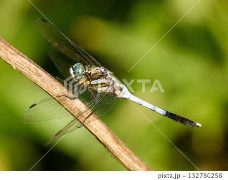 草にとまるシオカラトンボ 緑色の眼が綺麗です