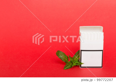 Pack of menthol cigarettes and fresh mint on colored table, Menthol cigarettes top view flat lay