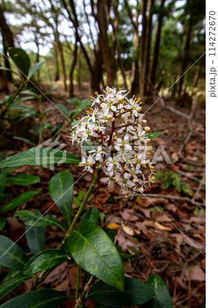 林の中に生えているミヤマシキミの花