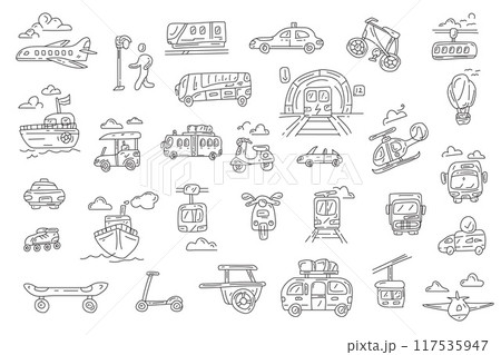 A collection of hand-drawn doodle icons depicting various modes of public transportation and vehicles, including buses, trains, airplanes, bikes, and ships, arranged on a white background