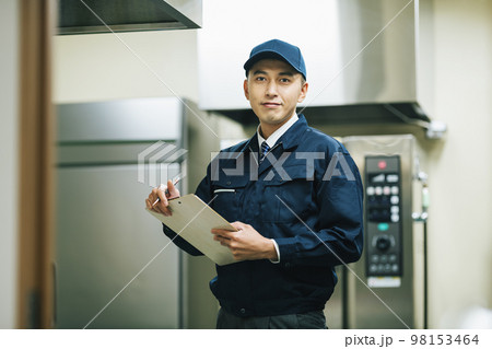 オフィスのWi-Fiをチェックする作業服のスタッフ ビジネスイメージ