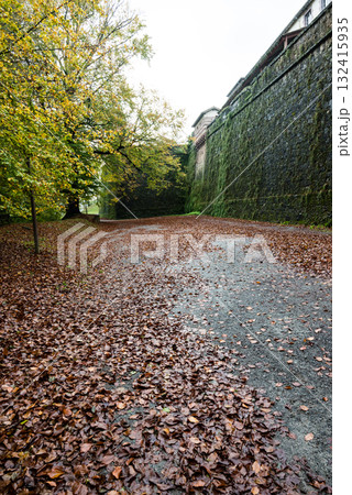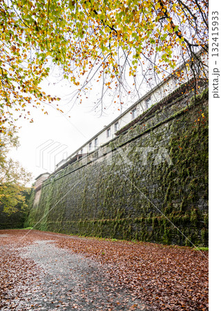 落ち葉と紅葉に囲まれた田舎町の歴史的な城塞後 フレンチバスク地方のサン・ジャン・ピエ・ド・ポールにて