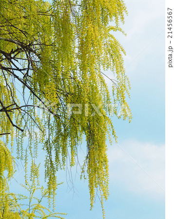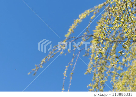 春の芽吹きの枝垂れヤナギと青空